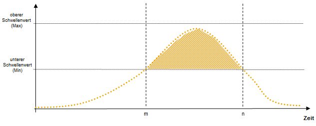 Um den Erfolg einer Maßnahme belegen zu können, müssen demzufolge sowohl für die Umsetzung als auch für die Wirkung Messkriterien definiert werden, die den Erfolgsnachweis erbringen sollen. Im Rahmen des hier vorgestellten Konzepts zum Controlling von Wissensmanagement-Maßnahmen geschieht dies anhand von Schwellenwerten. Ein Schwellenwert bezeichnet dabei allgemein einen Grenzwert. Oberhalb beziehungsweise unterhalb – je nach Definition – eines solchen Wertes befindet sich ein definierter Bereich. Abbildung 1 veranschaulicht die Funktionsweise. Die gepunktete Linie beschreibt einen beispielhaften Funktionsverlauf. Dabei erreicht die Funktion am X-Achsenabschnitt ‚m’ den unteren Schwellenwert und bleibt oberhalb dessen, bis sie am X-Achsenabschnitt ‚n’ wieder unter den Schwellenwert fällt. Zwischen ‚m’ und ‚n’, also im schraffierten Bereich, befinden sich die Messwerte somit in dem definierten Bereich.