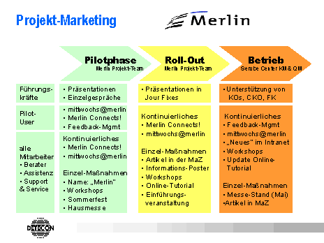 Ziel des Projekt-Marketings war die umfassende und zielgruppenspezifische Information über Ziele, Möglichkeiten und Grenzen von Merlin sowie der Aufbau von Kontakten zu den KM-Verantwortlichen, internen Kunden und Promotoren. Der Medieneinsatz orientierte sich an den Projektphasen und identifizierten Zielgruppen und bot diverse Möglichkeiten zur Interaktion.